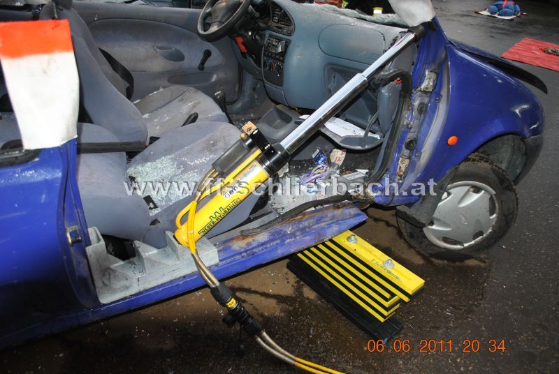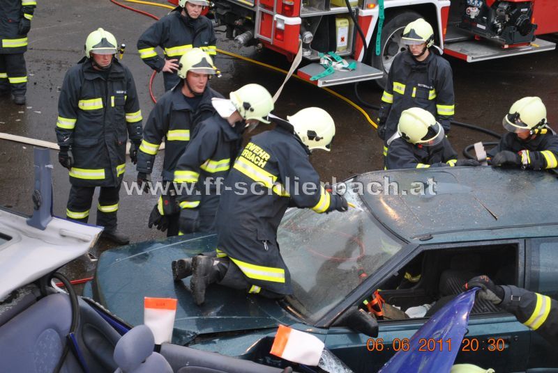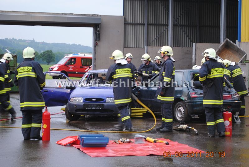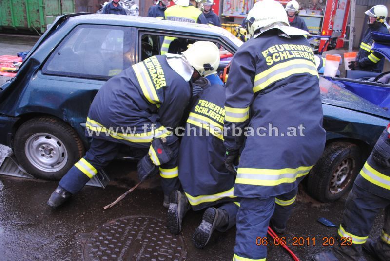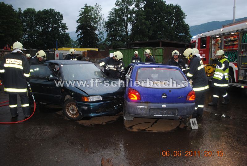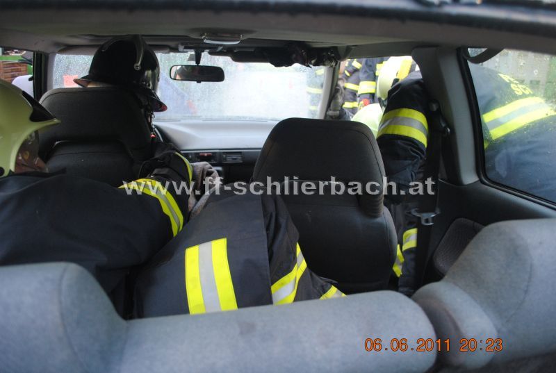 Nach der Absicherung der Einsatzstelle machten sich je eine Gruppe pro Fahrzeug ans Werk. Da wir in unserer Feuerwehr über zwei hydraulische Rettungsgeräte modernen Typs verfügen, war das Ziel schnell erreicht. Nach der Rettung der Personen wurden noch diverse Techniken, welche man bei einem solchen Einsatz anwenden kann, geübt.