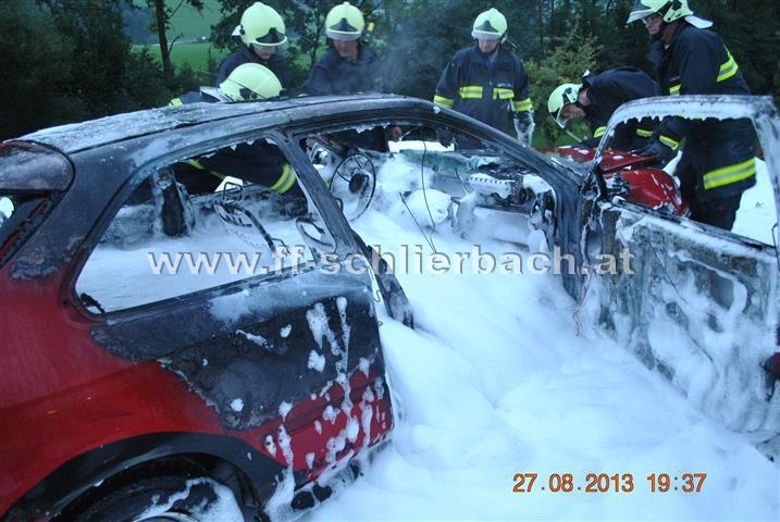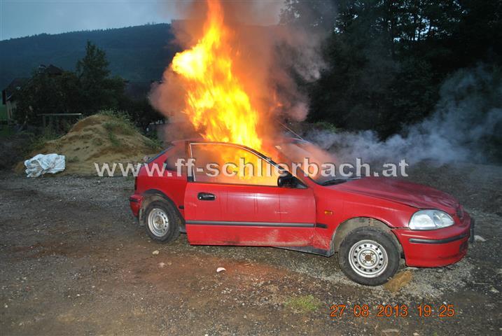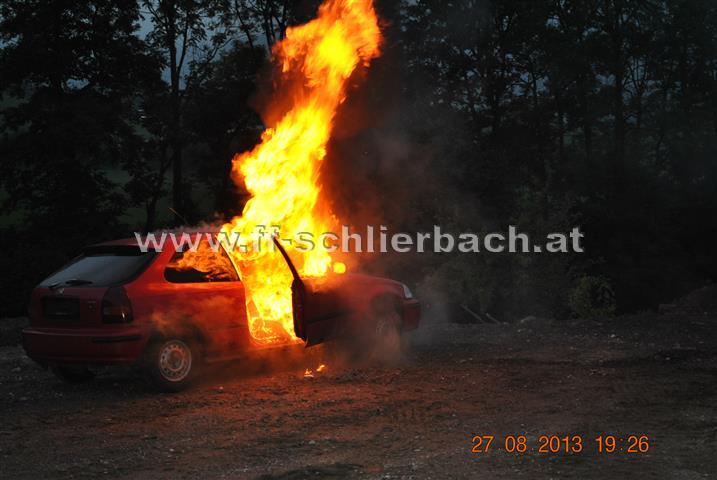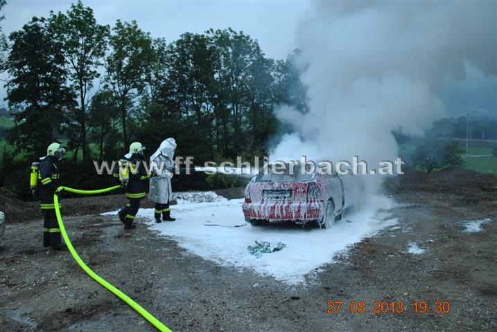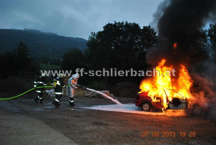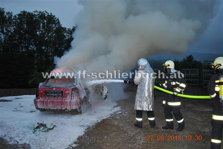 Am 27. August hielten wir eine „heiße“ Zwischenübung ab. Übungsannahme war, dass wir zu einem KFZ-Brand gerufen wurden. Während Tank Schlierbach den Löschangriff mit dem Schaumrohr vorbereitete, stellte Pumpe 2 Schlierbach die Wasserversorgung von Tank Schlierbach sicher. Schließlich startete ein ATS-Trupp den Löschangriff mit einem C-Hohlstrahlrohr und Schaumaufsatz.